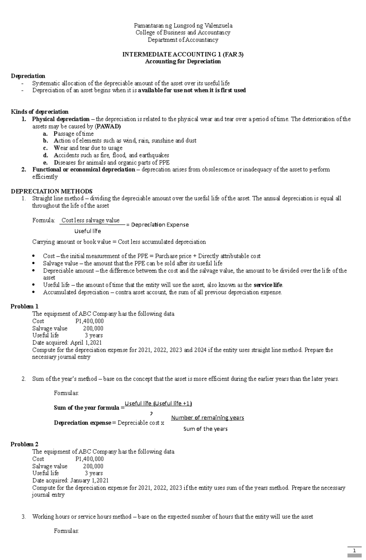 EECE 450 — Engineering Economics — Formula Sheet B= initial (purchase) value or cost basis S= estimated salvage value after depreciable life dt= depreciation charge in year t N= number of years in depreciable life Book value at end of period t: BV t = B −∑ = t i di 1 Straight-Line (SL): Annual charge: dt = (B – S)/N Book value at end of period t: BV t = B − t ×d Sum-of-Years ... What is the formula for depreciable cost? - Greedhead.net Read on to know depreciation expense formula for SLD: Annual Depreciation Expense = (Cost of an asset - Salvage Value)/Useful life of an asset Cost of the asset is said to be a purchase price or historical cost Salvage value is the value of the asset remaining after its useful life Which is an example of a depreciable cost? Declining Balance Depreciation Calculator Calculator Use. Use this calculator to calculate an accelerated depreciation of an asset for a specified period. A depreciation factor of 200% of straight line depreciation, or 2, is most commonly called the Double Declining Balance Method.Use this calculator, for example, for depreciation rates entered as 1.5 for 150%, 1.75 for 175%, 2 for 200%, 3 for 300%, etc.