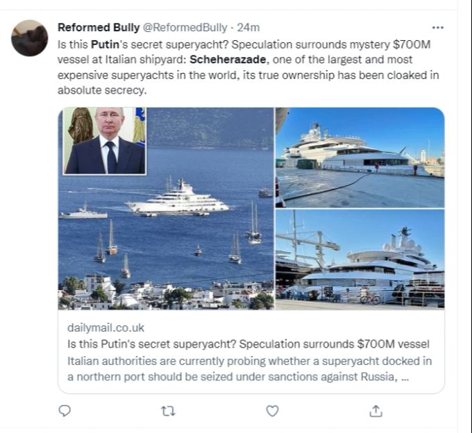 A mysterious superyacht docked in Italy has a crew that includes... If it looks like Putin's Yacht, smells like Putin's Yacht and carries Russian presidential security personnel; it's Some info about Scheherazade and behavior in the super yacht industry: https...