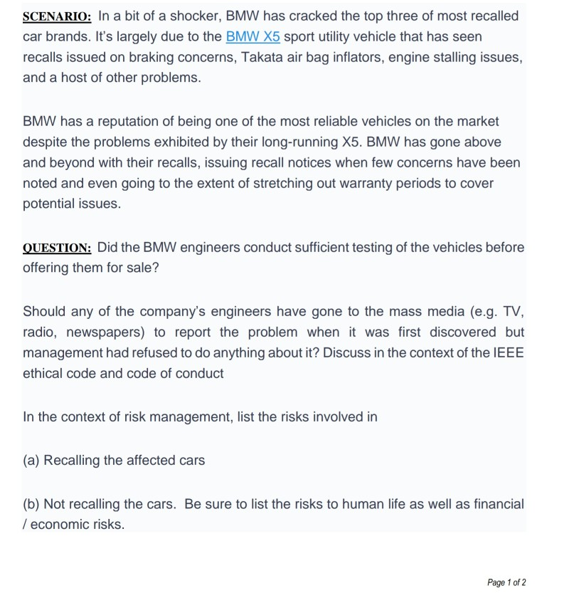 BMW Recall Information | BMW UK BMW RECALL INFORMATION. A recall is a safety critical action implemented by the manufacturer due to design or construction tolerance which may affect the safe operation of the product. BMW operates in accordance with the code of practice on safety defects...